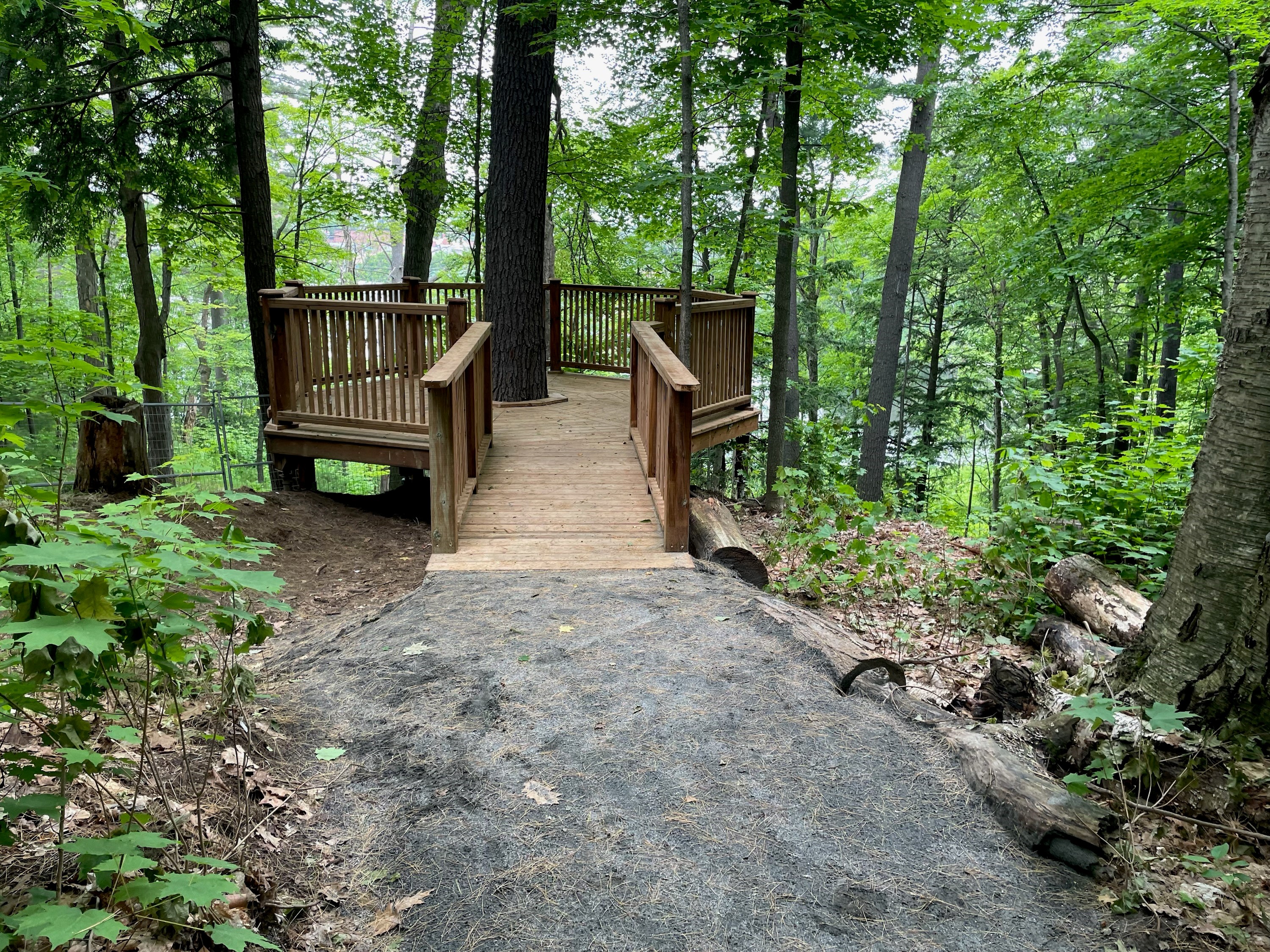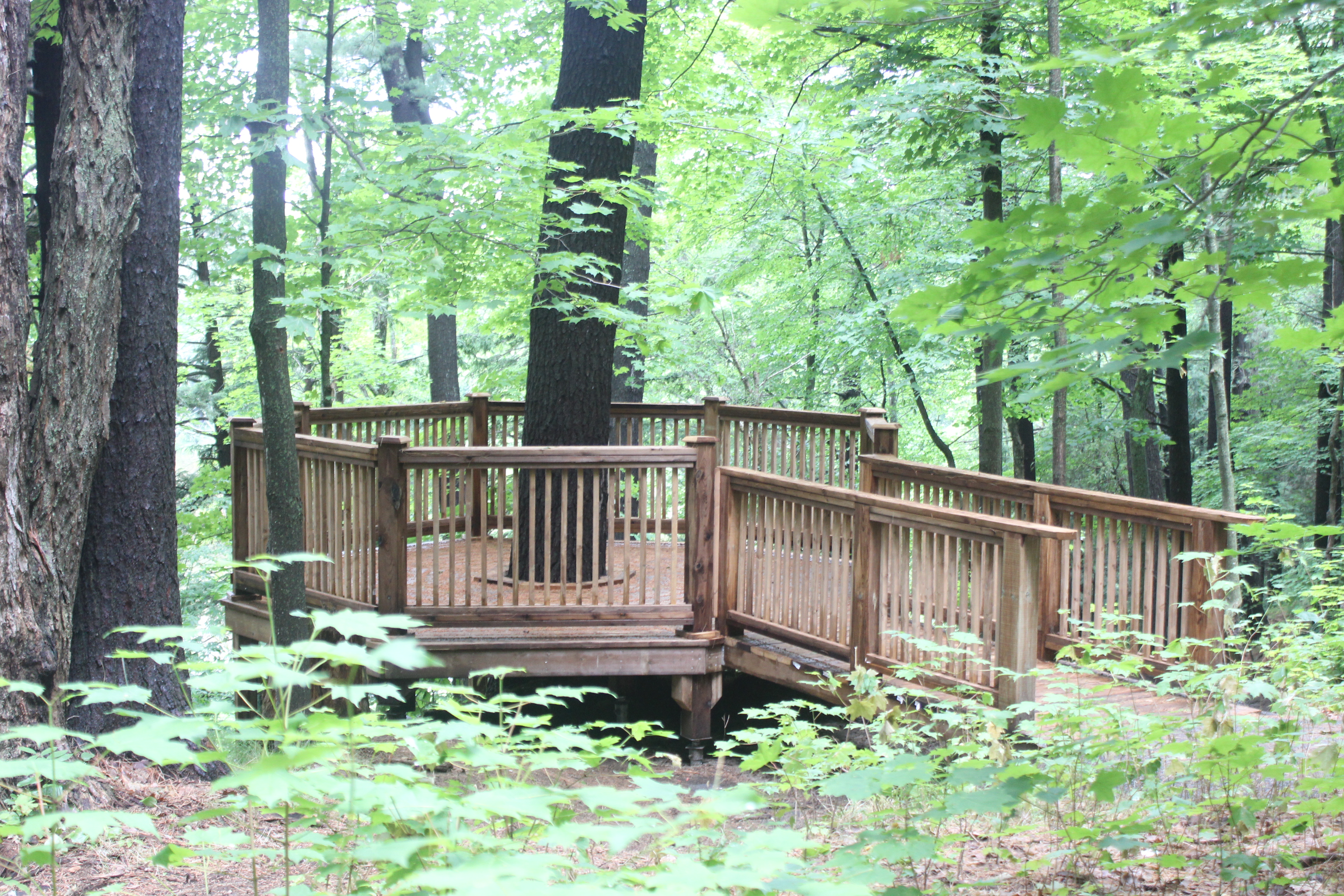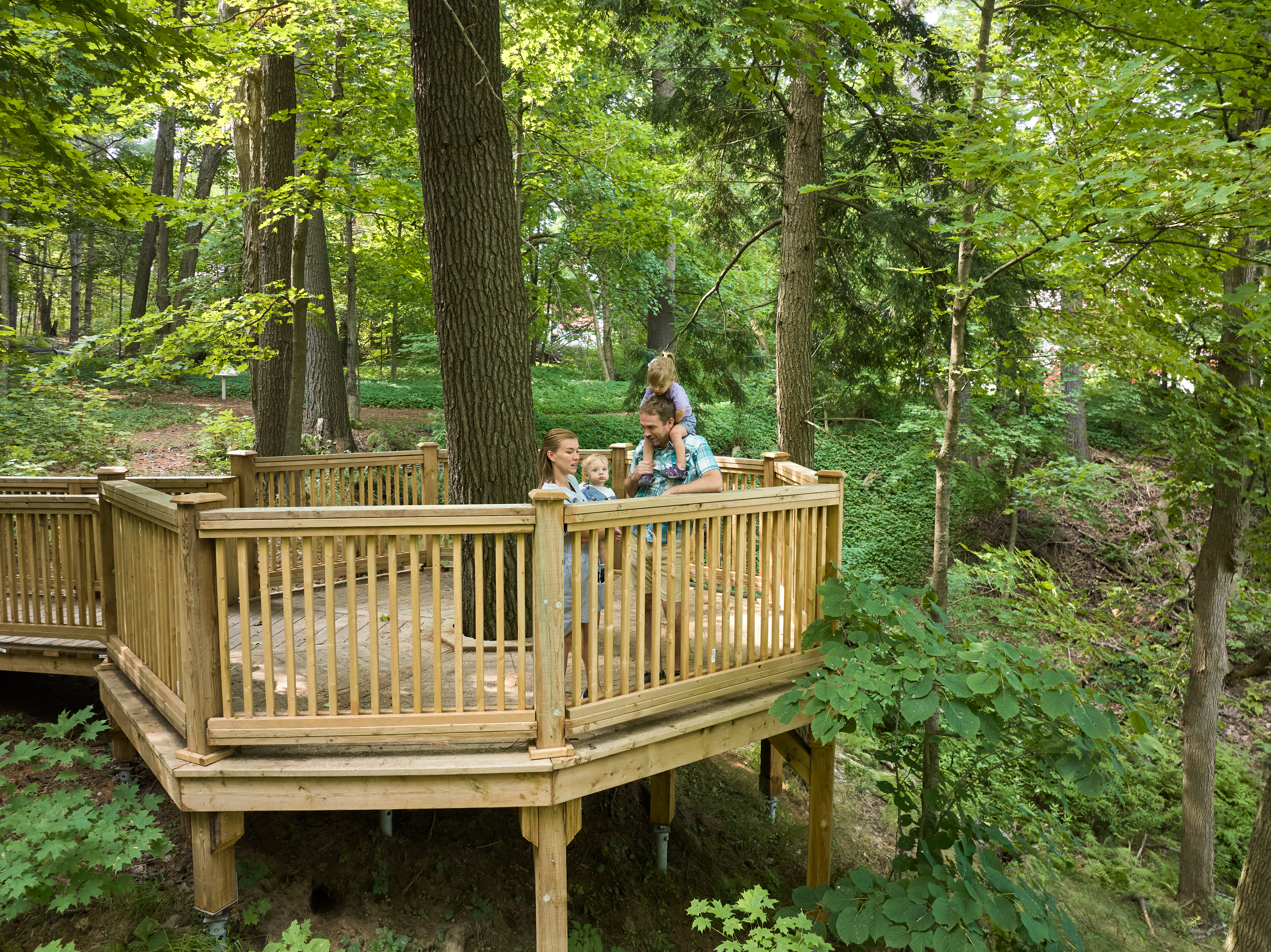 As you make your way through the Storybook Trail, you will come to the newest addition to the property, the observation deck. Positioned to overlook the Muskoka River, the newly constructed observation deck creates a peaceful space for visitors to enjoy a new viewpoint and perspective of Downtown Bracebridge, and further showcases the old-growth forest. The octagonal shape draws inspiration from Woodchester itself and provides plenty of space to view the abundance of surrounding nature. The Town gratefully acknowledges that construction of the observation deck was funded in part by the Ontario Ministry of Agriculture, Food, and Rural Affairs, and the Rotary Club of Bracebridge.