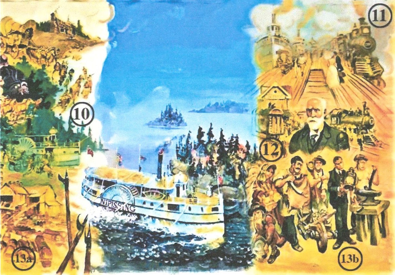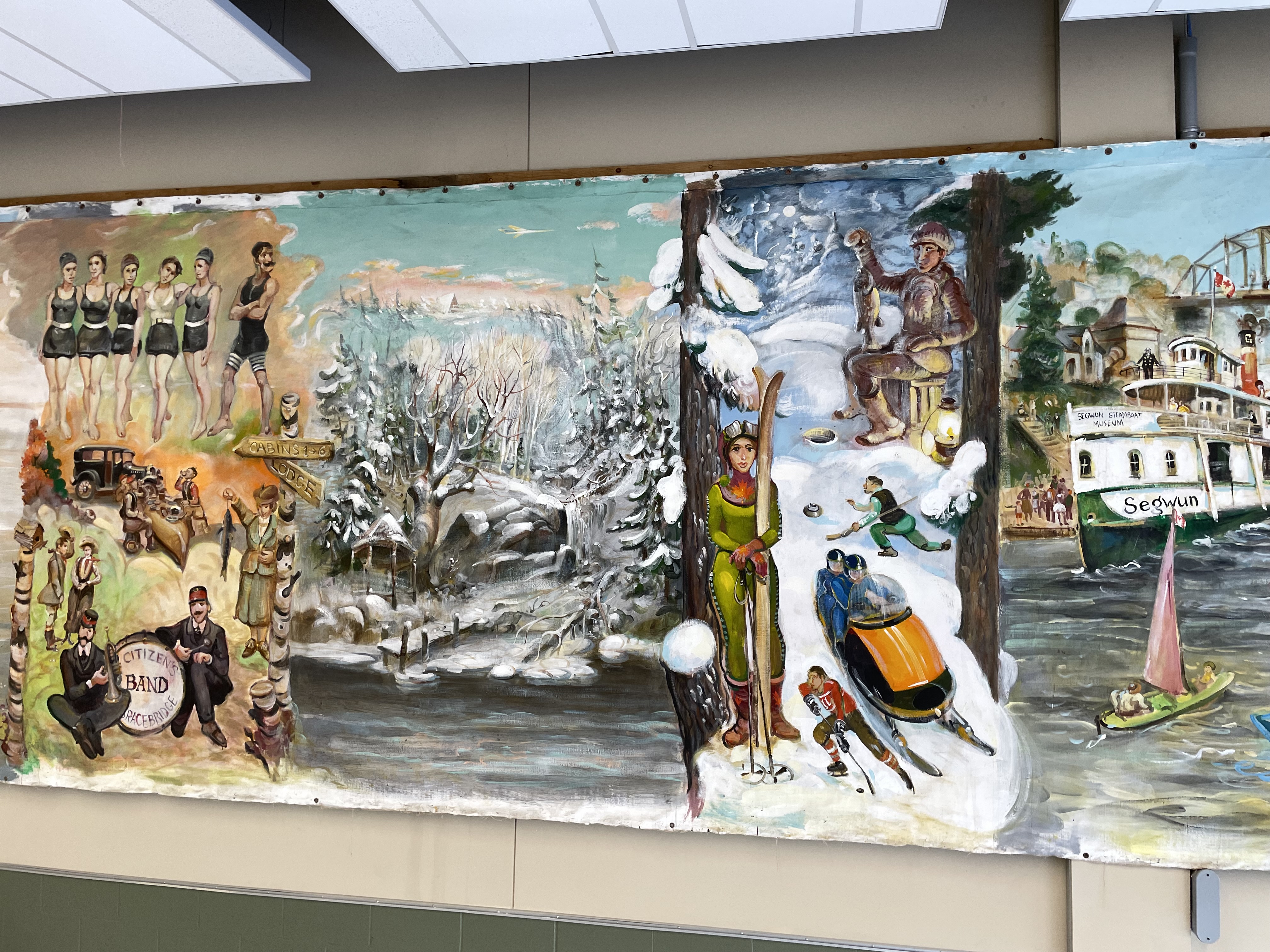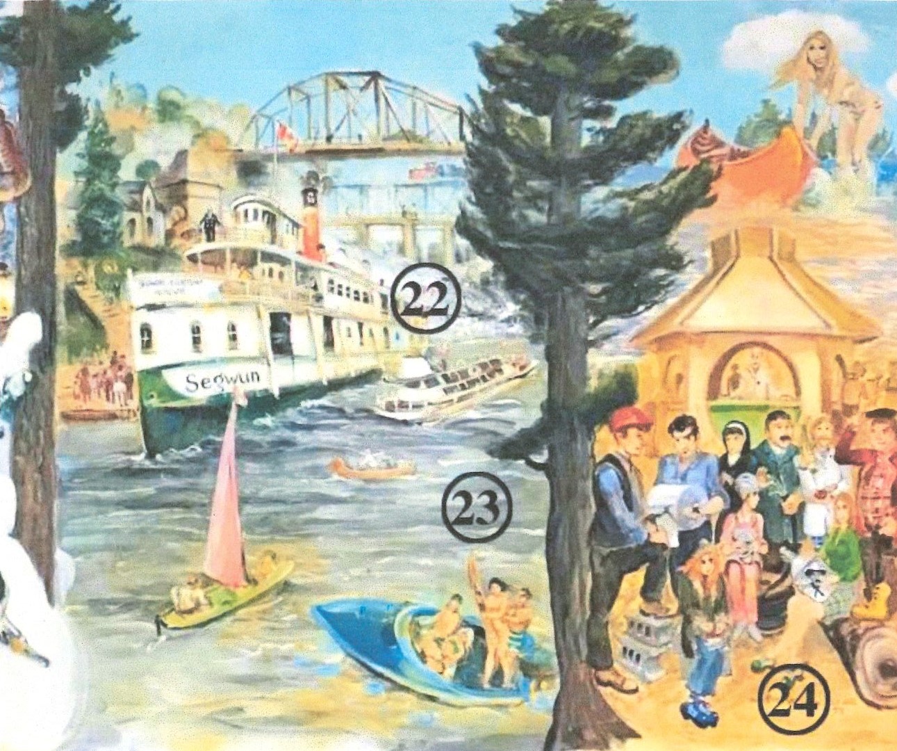 2. Prior to European settlement, Muskoka was home to a number of Indigenous tribes at different times, including the Iroquois, Ojibwa, Algonquin, Chippewa, Huron, and Mississauga. One popular camping location during their travels was the flatland at the base of the North Branch of the Muskoka River, near what is now Bracebridge Bay Park. This depiction shows a young Indigenous couple disembarking from their birchbark canoe at this historic site.