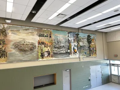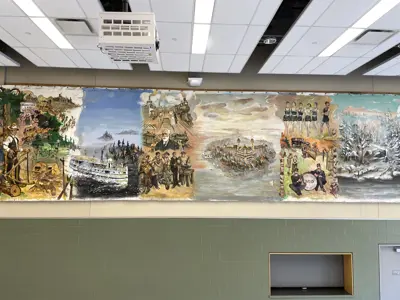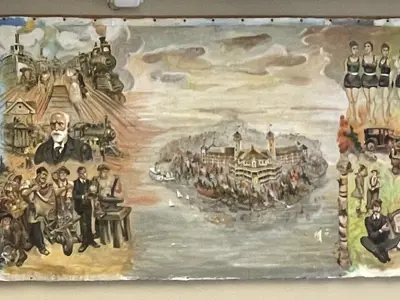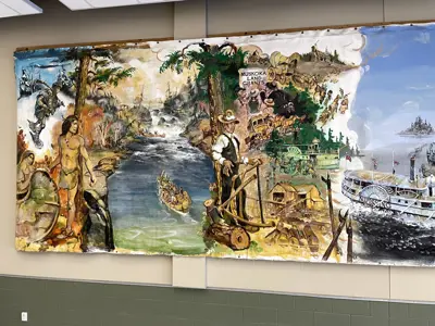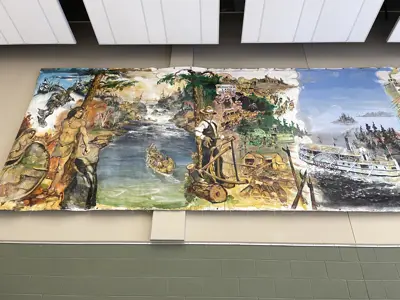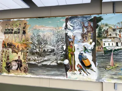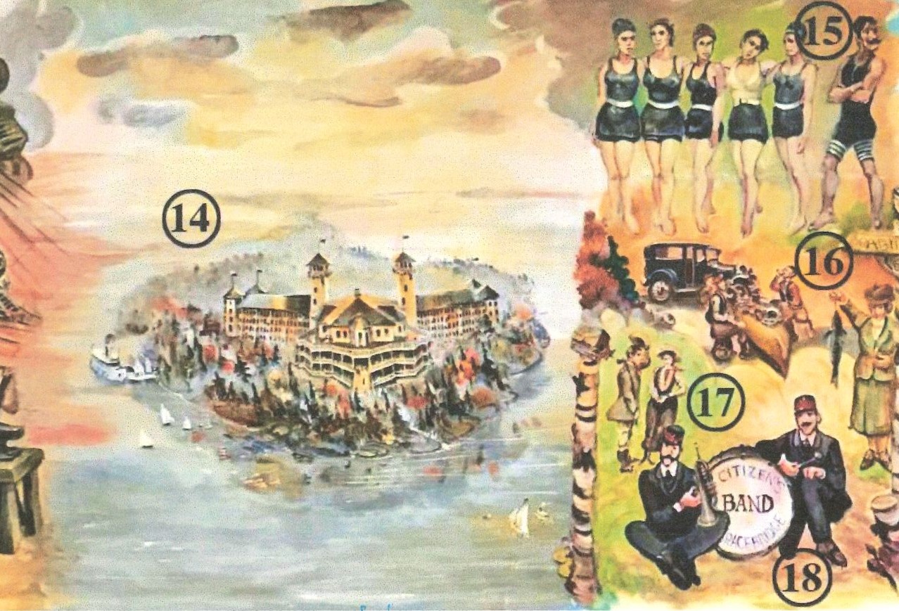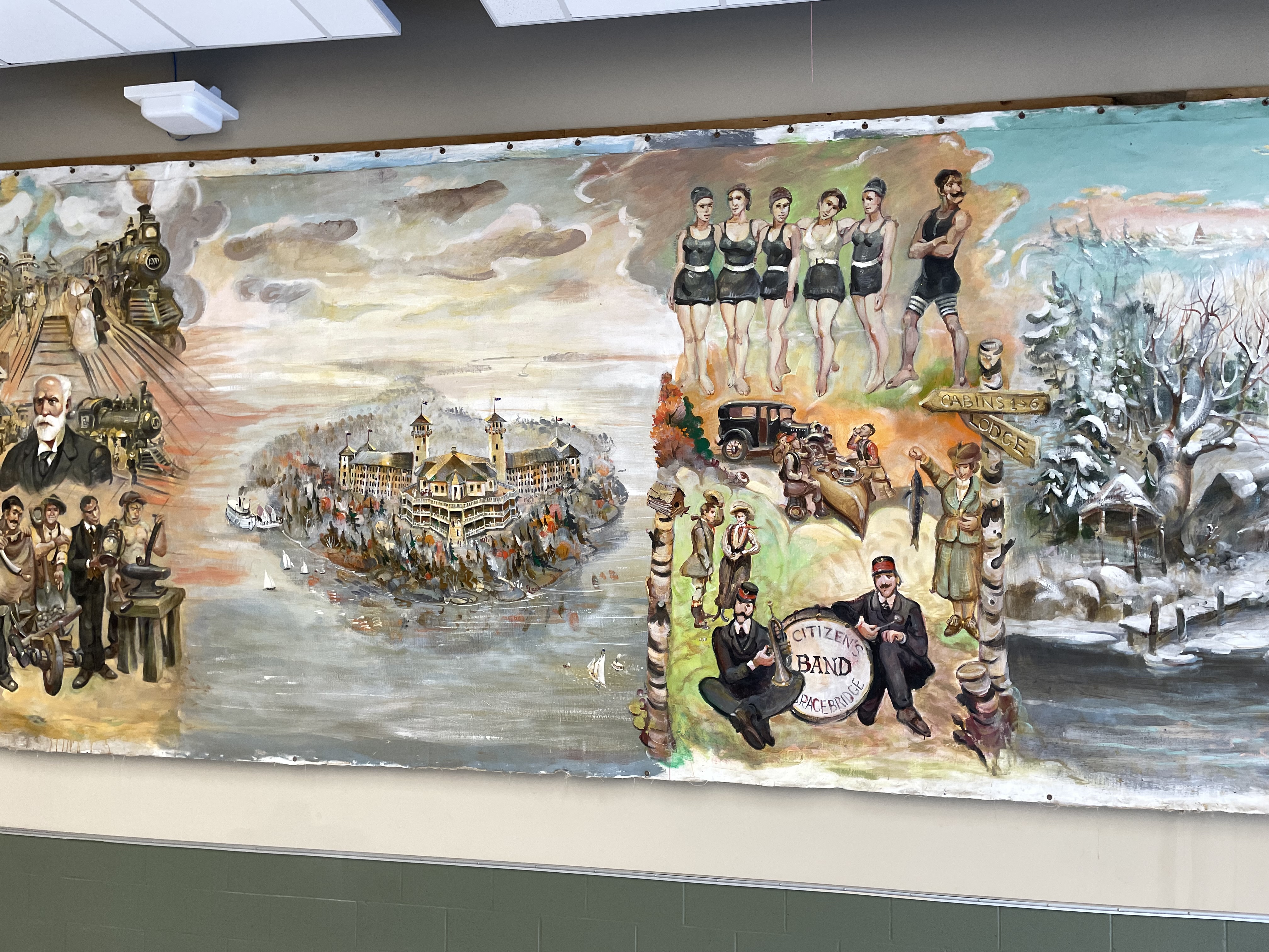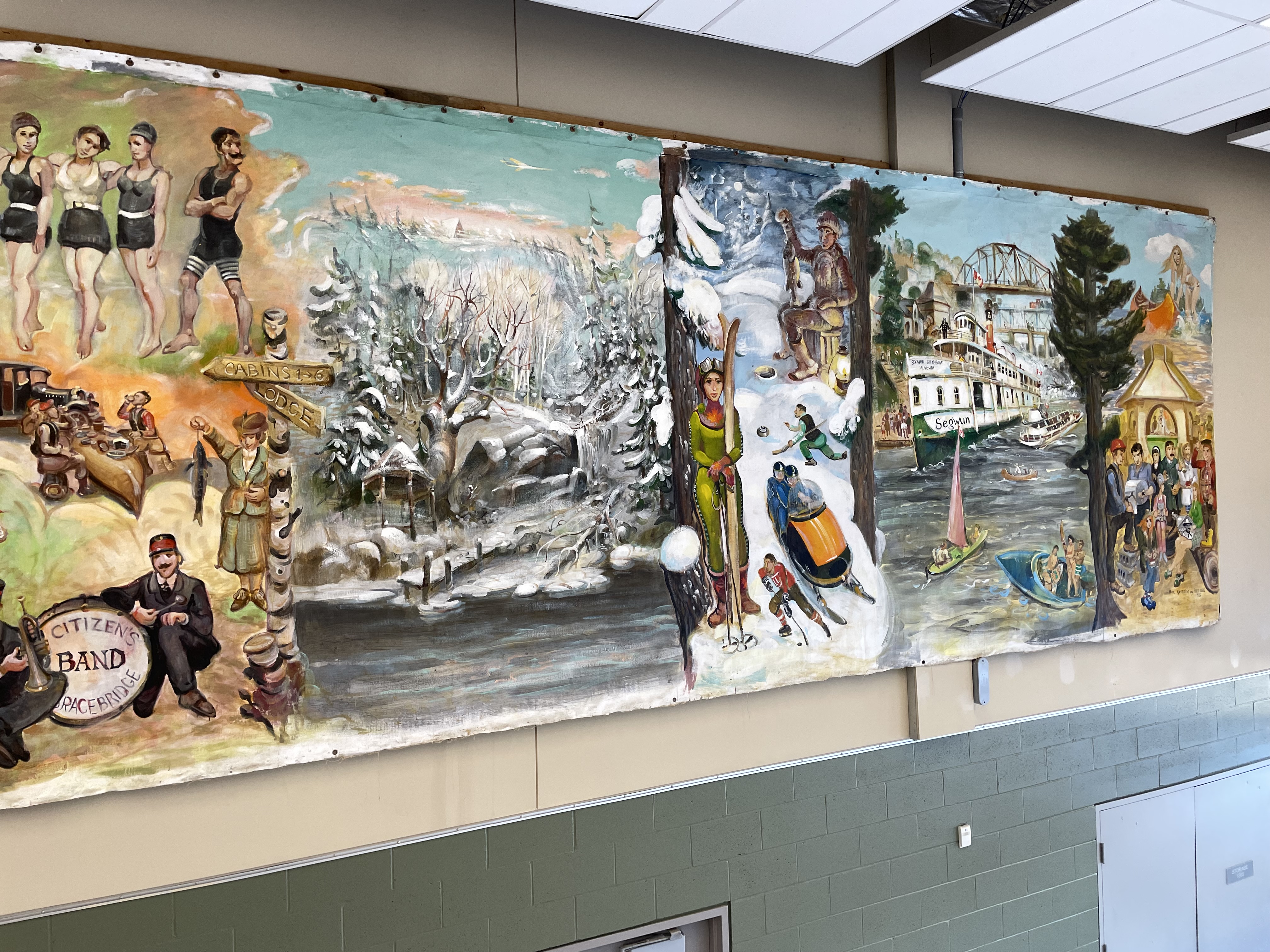 2. Prior to European settlement, Muskoka was home to a number of Indigenous tribes at different times, including the Iroquois, Ojibwa, Algonquin, Chippewa, Huron, and Mississauga. One popular camping location during their travels was the flatland at the base of the North Branch of the Muskoka River, near what is now Bracebridge Bay Park. This depiction shows a young Indigenous couple disembarking from their birchbark canoe at this historic site.