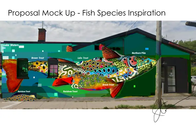 Comrie’s large-scale mural uses bold colours, flowing movement, and local imagery to reflect Bracebridge’s strong connection to nature and water. Inspired by the waterfalls, rivers, and lakes that define Muskoka, the mural incorporates abstract patterns drawn from local fish species such as rainbow trout, northern pike, and lake trout. Shades of blue, green, and vibrant accents come together to evoke healing, balance, and renewal; themes central to Comrie’s work with colour therapy.