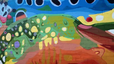 Comrie’s large-scale mural uses bold colours, flowing movement, and local imagery to reflect Bracebridge’s strong connection to nature and water. Inspired by the waterfalls, rivers, and lakes that define Muskoka, the mural incorporates abstract patterns drawn from local fish species such as rainbow trout, northern pike, and lake trout. Shades of blue, green, and vibrant accents come together to evoke healing, balance, and renewal; themes central to Comrie’s work with colour therapy.