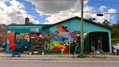 Jacquie Comrie built strong local connections for the project by collaborating with local arts organization Muskoka Arts and Crafts to engage emerging artists. She mentored two production assistants who supported her in creating the mural: Brynn Kirbyson, a Bracebridge resident, and Jamie Sword, who has ties to the area. Both received hands-on training in large-scale mural creation to support their artistic careers.