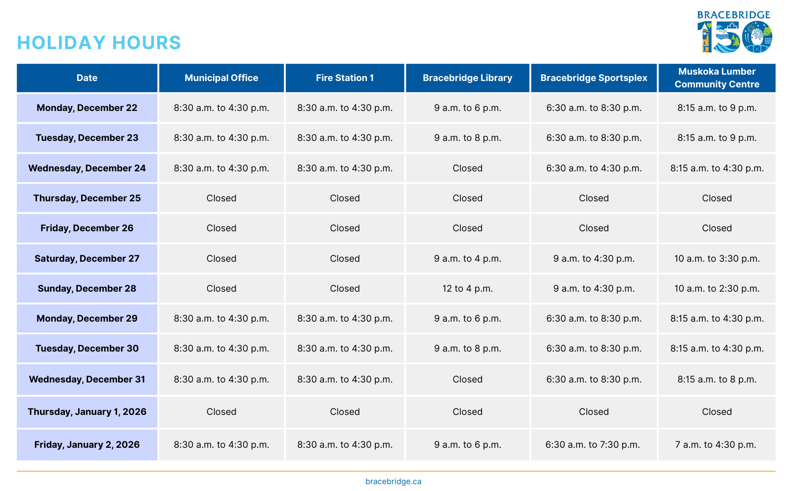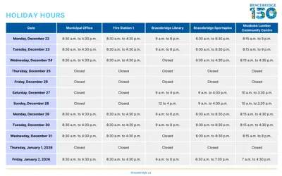 BRACEBRIDGE, ON (December 15, 2025) – Due to the holidays, hours of operation for Town services and facilities will vary. Please refer to the chart below for details.